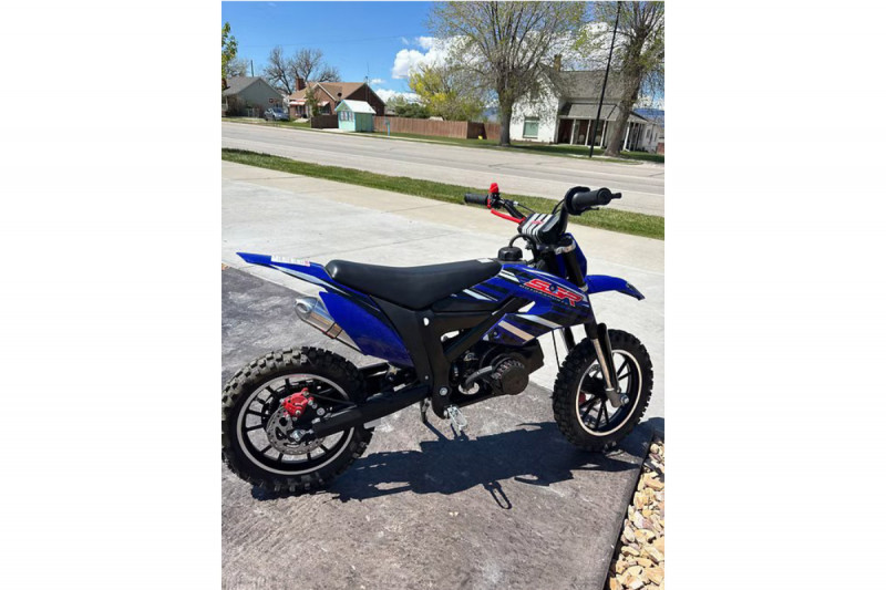 The 2022 SSR SX50 is a 50cc two-stroke pit bike for young riders, featuring a 2.4 hp air-cooled engine, automatic transmission, and a steel frame. Key features include a spring inverted front fork, a single rear shock, hydraulic disc brakes front and rear, aluminum alloy wheels, and a pull starter. The bike has a 23-inch seat height, 8.5-inch ground clearance