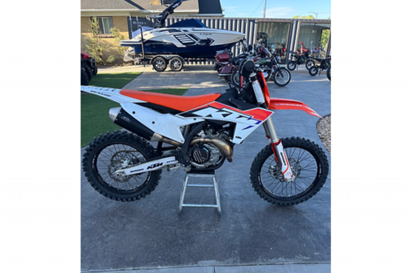 The 2023 KTM 450 SX-F is a high-performance motocross bike powered by a 449.9cc, single-cylinder, 4-stroke engine.