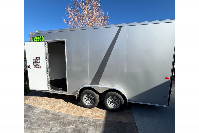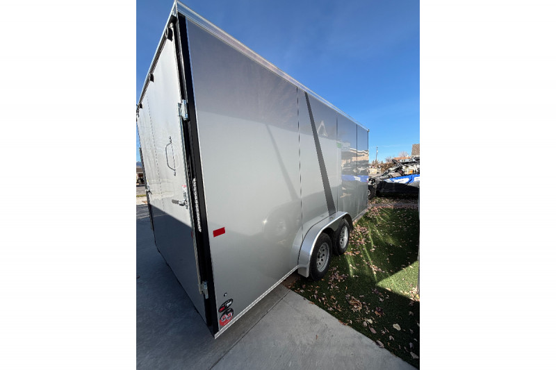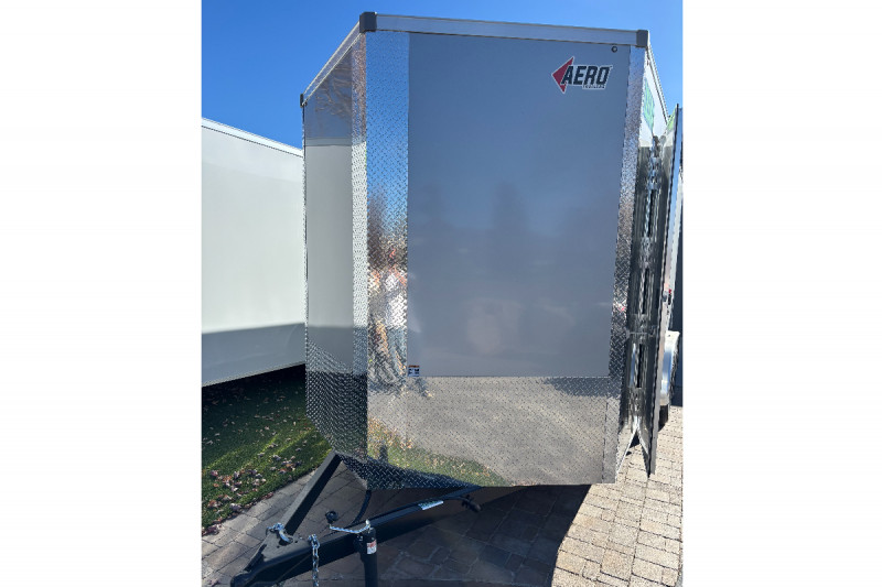 A 2025 Aero enclosed trailer is a cargo trailer with a smooth, screwless aluminum exterior, tubular construction, and LED lights, featuring a rear ramp door with an assist and a side entry door.